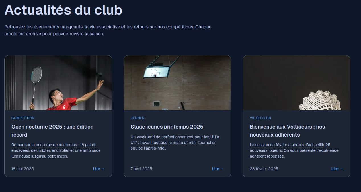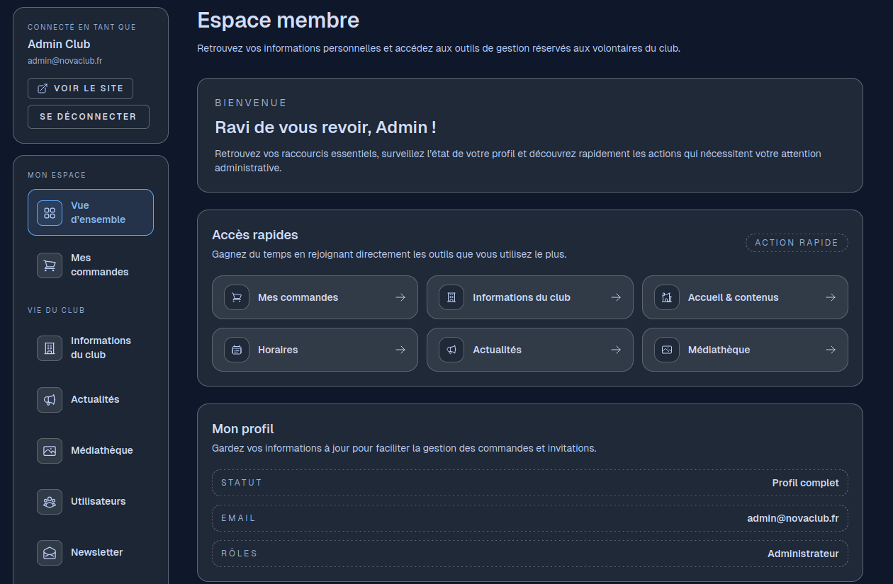 Personnalisez vos pages, invitez vos membres et ouvrez la boutique du club. Quelques minutes suffisent pour mettre en ligne une vitrine prête à accueillir de nouveaux contacts.