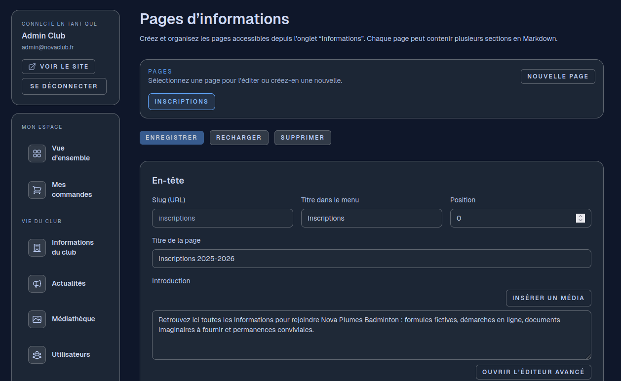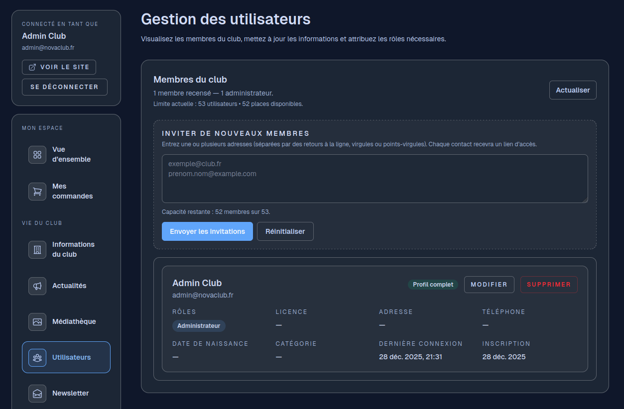 Personnalisez vos pages, invitez vos membres et ouvrez la boutique du club. Quelques minutes suffisent pour mettre en ligne une vitrine prête à accueillir de nouveaux contacts.